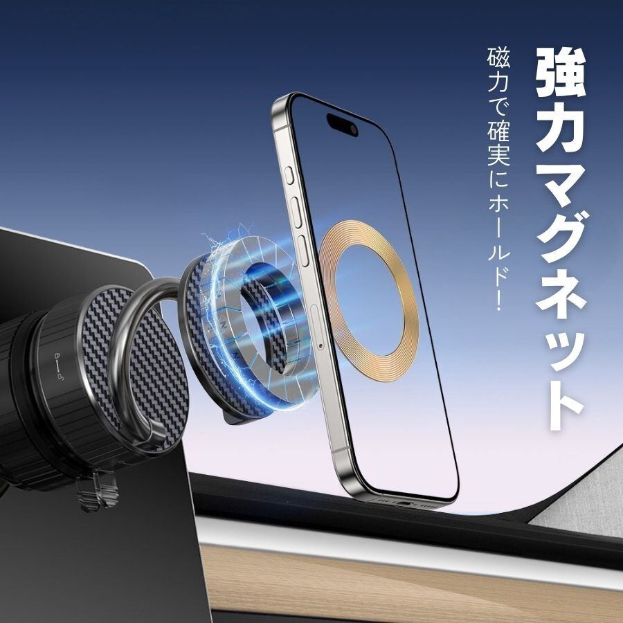 【強力マグネット】 磁力で確実にホールド! 超強力ネオジウム磁石採用。ちょっとした衝撃や振動でもスマホが外れる心配が大幅に減り、安心感が違います。