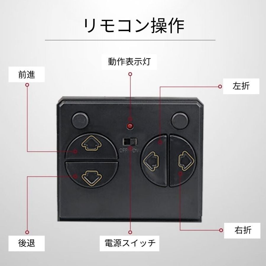 【高い機動性と操作性】 360度その場回転で狭い場所でも自由自在。2.4GHz無線で操作レスポンスが速く、混信しません。シンプルな4chリモコンで直感的に操作できます。